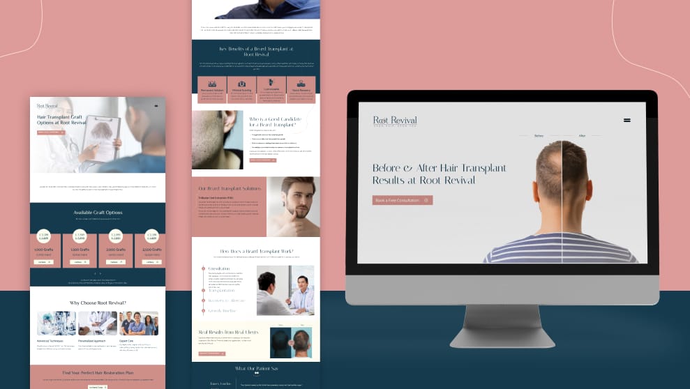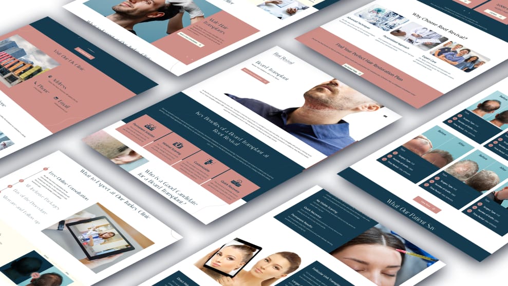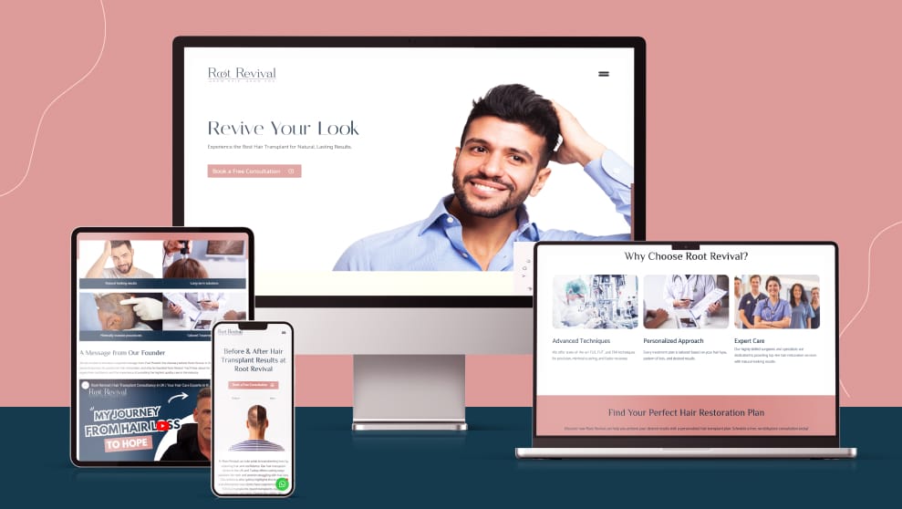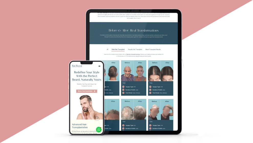 Root Revival, a leading hair transplant consultancy in the UK, sought an online presence to connect with clients struggling with hair loss. Previously without a website, Root Revival aimed to establish a platform where visitors could access detailed information on treatments for hair thinning, baldness, and beard transplants, as well as client testimonials and resources. The project involved creating an interactive, user-friendly website that reflects the brand's commitment to customised care and exceptional hair restoration results.