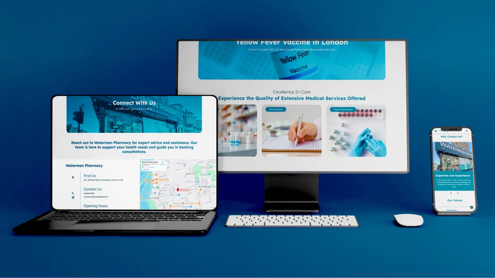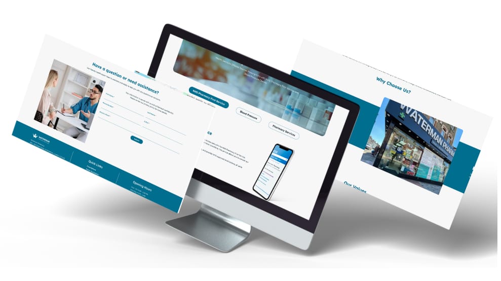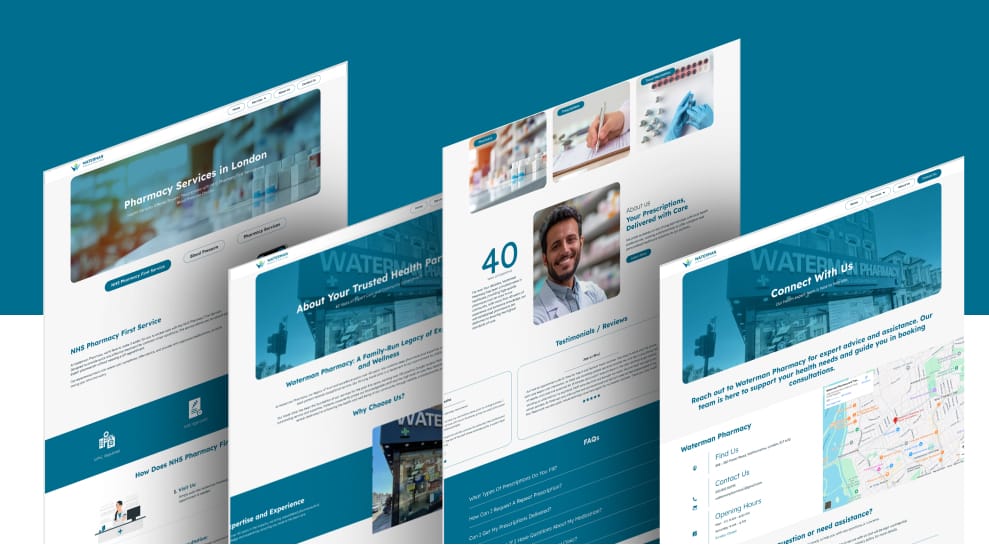 Waterman Pharmacy, a trusted healthcare service centre. They were looking for a modern, dynamic online platform suitable for their local community to access their services. The pharmacy highlighted its extensive services, including NHS Pharmacy First and Blood Pressure Checking while providing easy access to appointment bookings, prescription services, and patient resources. The project involved designing a user-friendly website that embodies Waterman Pharmacy’s commitment to personalised care, community health, and innovation.